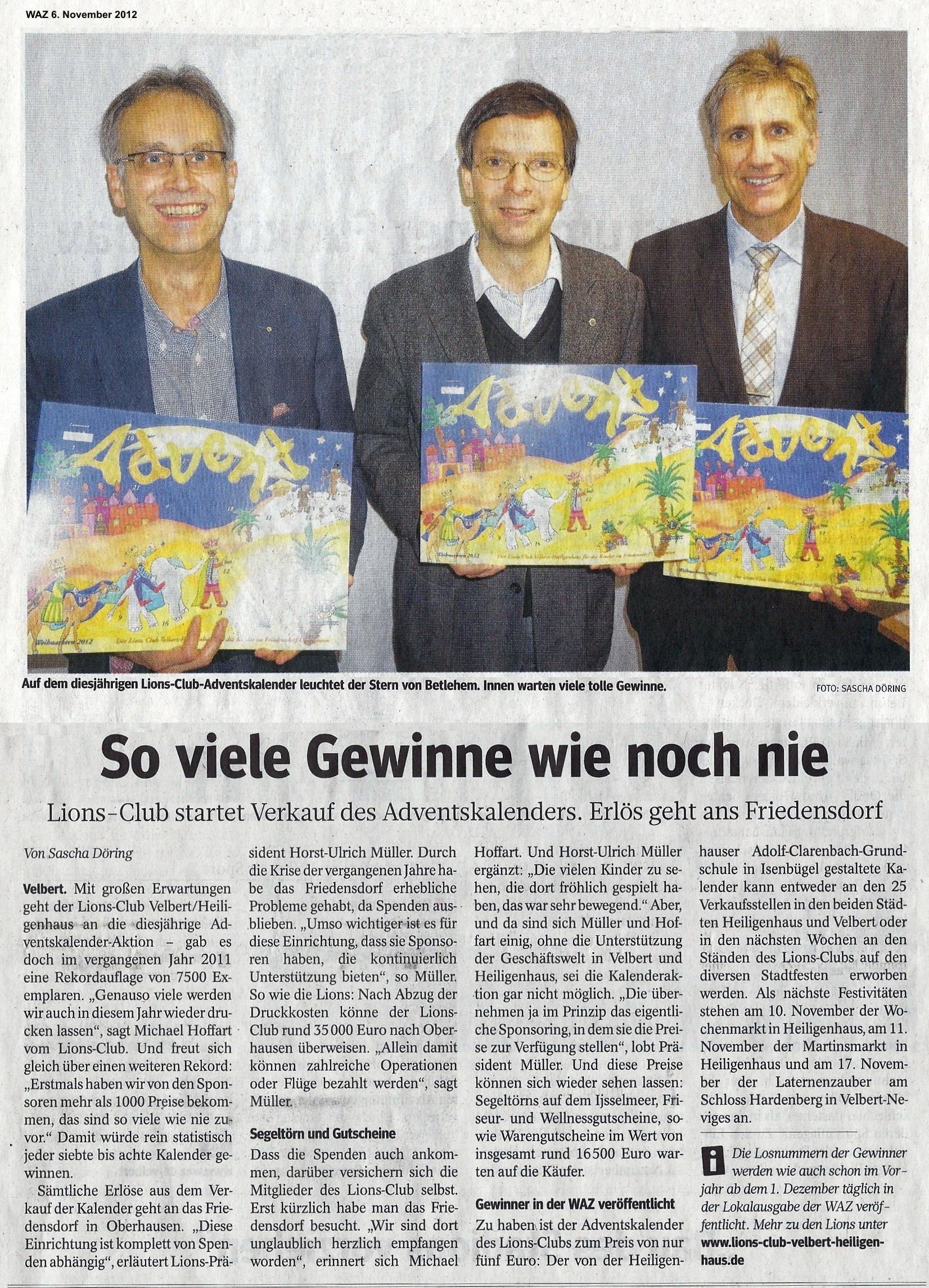 Mit großen Erwartungen geht der Lions-Club Vel- bert/Heiligenhaus an die diesjährige Advents- kalender-Aktion - gab es doch im vergangenen Jahr 2011 eine Rekordauflage von 7500 Exemplaren. "Genauso viele werden wir auch in diesem Jahr wieder drucken lassen", sagt Michael Hoffart vom Lions-Club ...