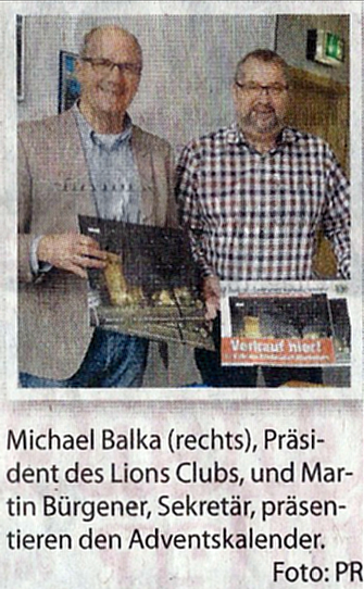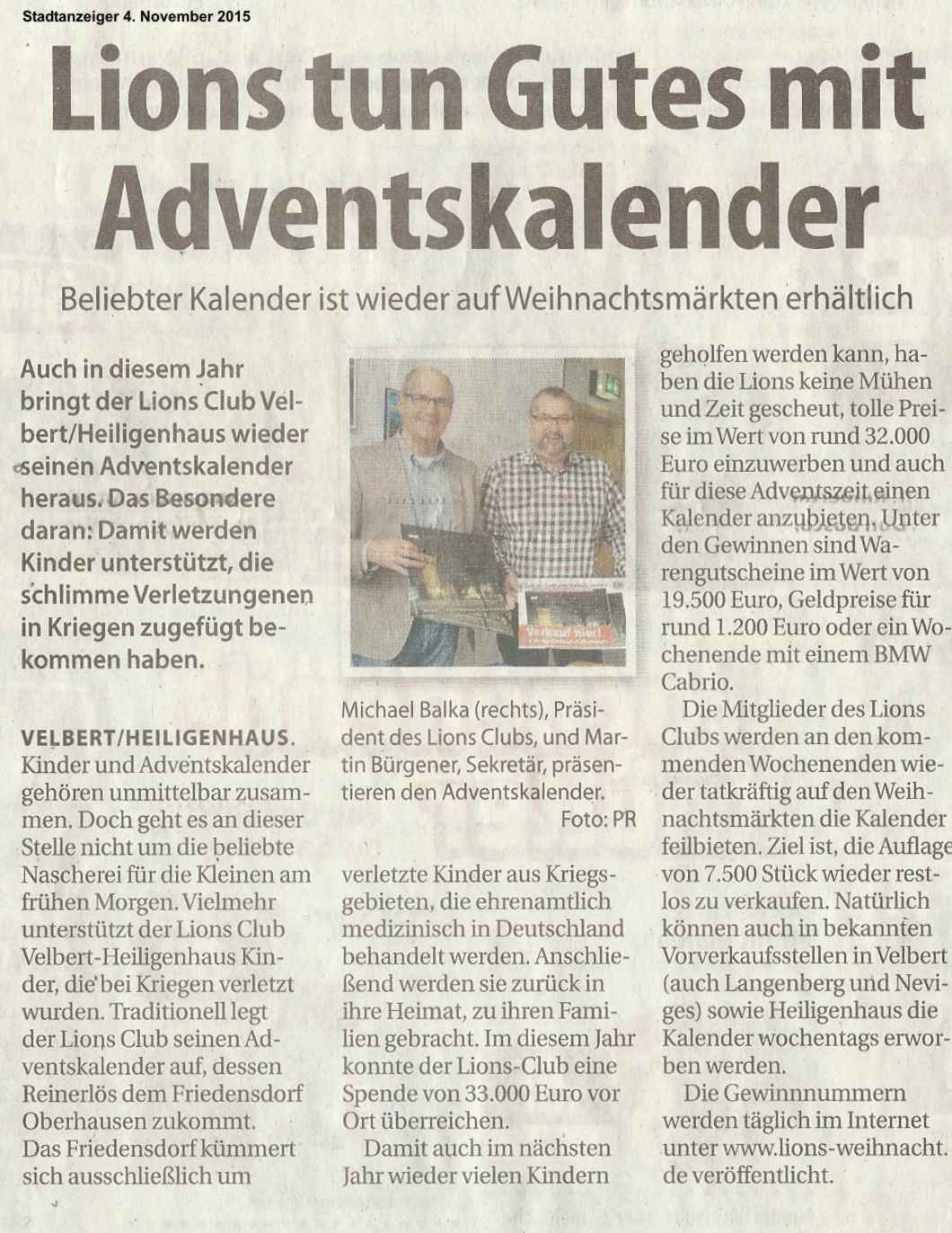 Beliebter Kalender ist wieder auf Weihnachtsmärkten erhältlich Auch in diesem Jahr bringt der Lions Club Velbert/Heiligenhaus wieder seinen Adventskalender heraus. Das Besondere daran: Damit werden Kinder unterstützt, die schlimme Verletzungen in Kriegen zugefügt bekommen haben ...
