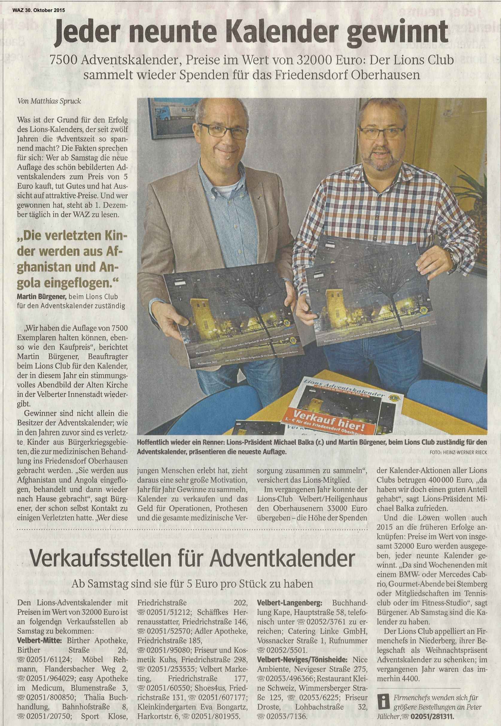7500 Adventskalender, Preise im Wert von 32000 Euro: Der Lions Club sammelt wieder Spenden für das Friedensdorf Oberhausen ...