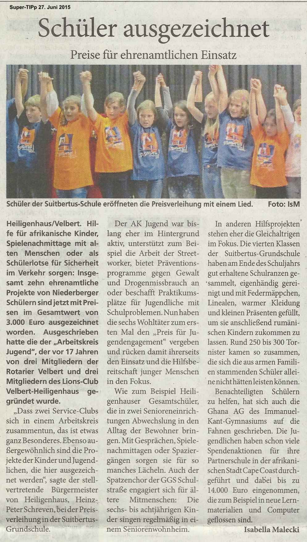Hilfe für afrikanische Kinder, Spielnachmittage mit alten Menschen oder als Schülerlotse für Sicherheit im Verkehr sorgen: Insgesamt zehn ehrenamtliche Projekte von Niederberger Schülern sind jetzt mit Preisen im Gesamtwert von 3.000 Euro ausgezeichnet worden. Ausgeschrieben hatte die der "Arbeitskreis Jugend", der vor 17 Jahren von drei Mitgliedern der Rotarier Velbert und drei Mitgliedern des Lions-Club Velbert-Heiligenhaus gegründet wurde ...