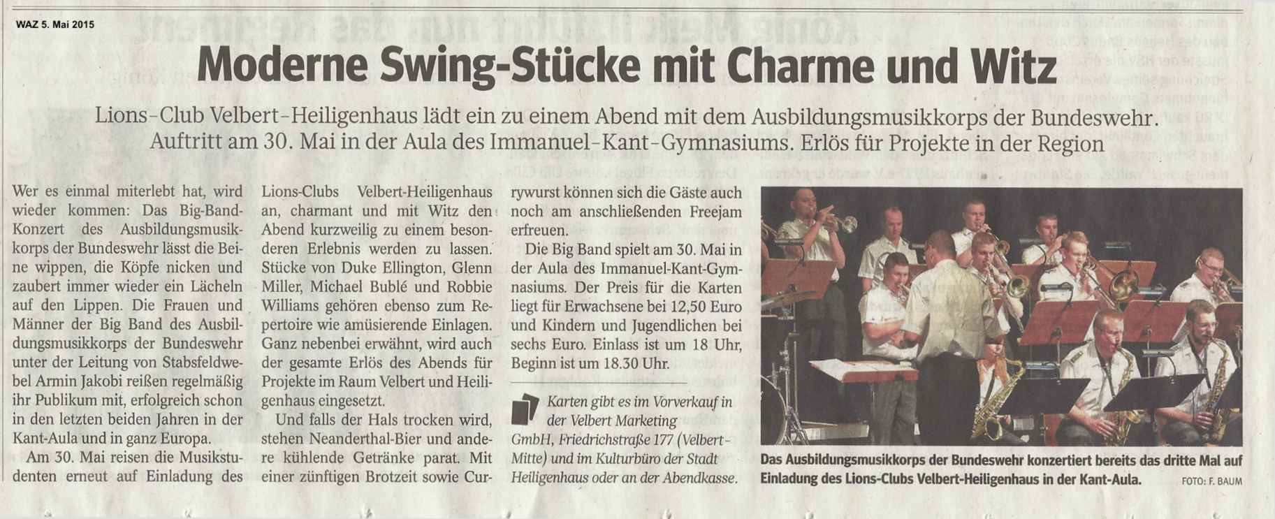 Wer es einmal miterlebt hat, wird wieder kommen: Das Big-Band-Konzert des Ausbildungsmusikkorps der Bundeswehr lässt die Beine wippen, die Köpfe nicken und zaubert immer wieder ein Lächeln auf [die] Lippen. Die Frauen und Männer der Big Band des Ausbildungsmusikkorps der Bundeswehr unter der Leitung von Stabsfeldwebel Armin Jakobi reißen regelmäßig ihr Publikum mit, erfolgreich schon in den letzten beiden Jahren in der Kant-Aula und in ganz Europa. Am 30. Mai reisen die Musikstudenten erneut auf Einladung des Lions-Clubs Velbert-Heiligenhaus an ...
